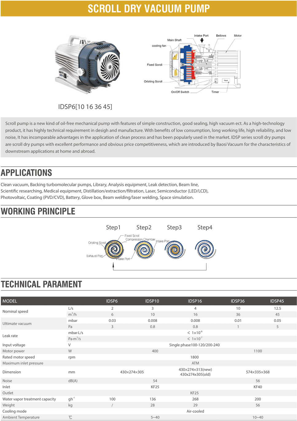 Bơm chân không Baosi IDSP10, bơm hút chân không Baosi IDSP10, Baosi scroll dry vacuum pump IDSP10 thuộc dạng bơm hút chân không khô, không dầu (scroll dry vacuum pump), có lưu lượng max: 10 m3/h, độ chân không sâu nhất: 0.008 mbar (8.10-3mbar), độ dò rỉ tĩnh < 1x10-6mbar, chuyên dùng để hút chân không trong công nghiệp.