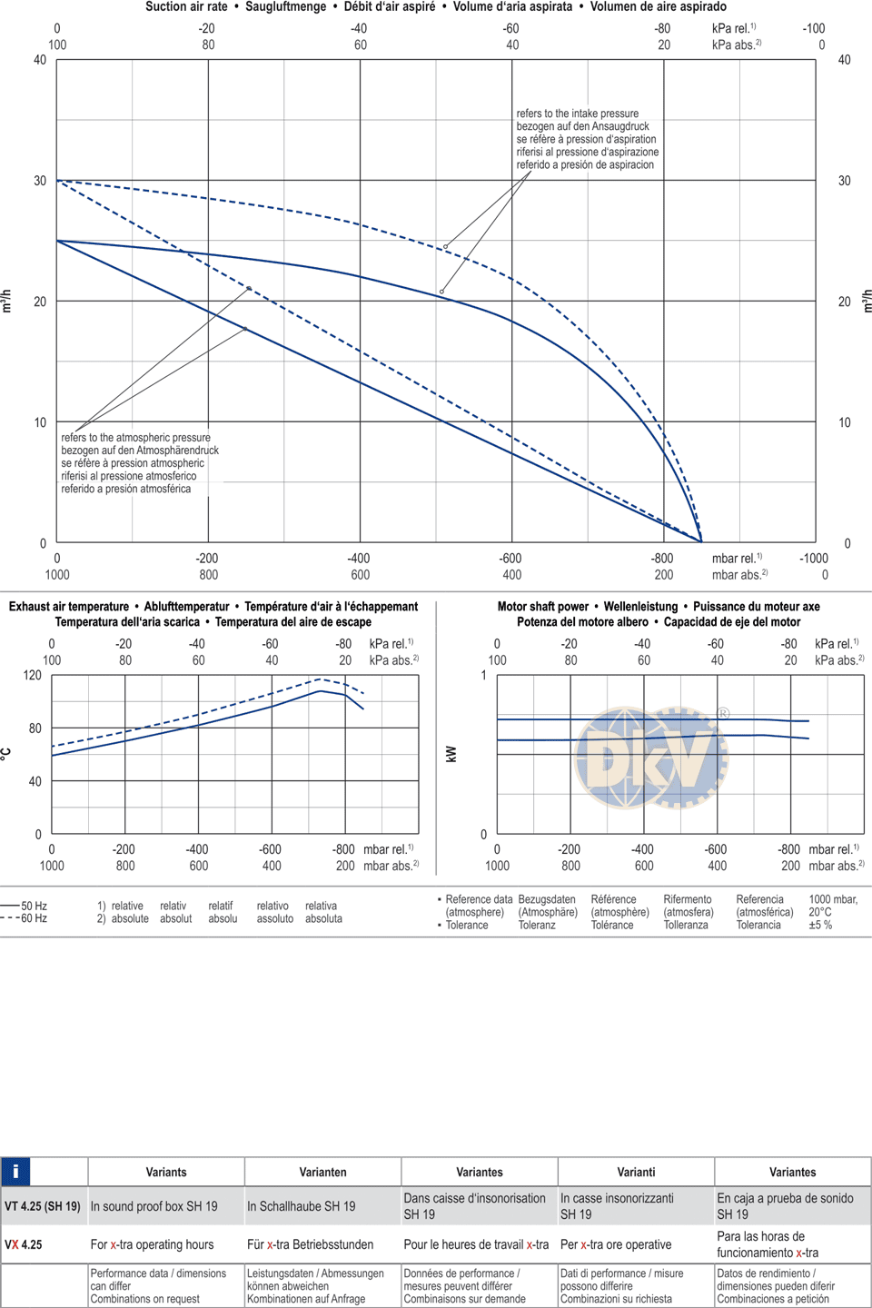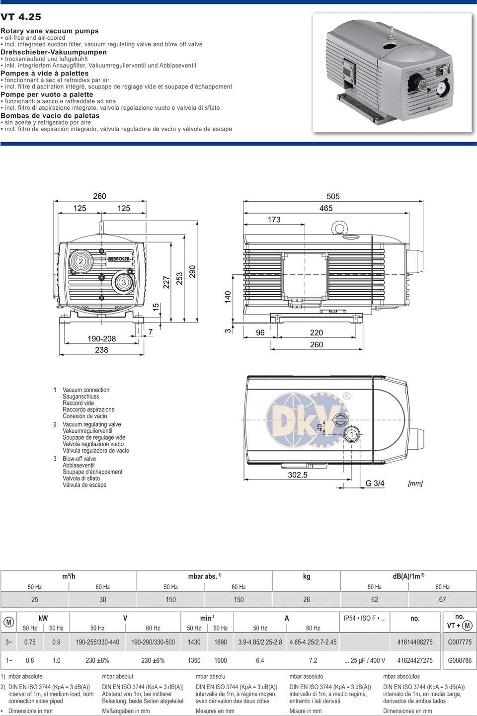 Bơm chân không Beker VT 4.25 gắn động cơ: 0.8 kW/220 - 230V/50Hz/1ph hoặc 0.75 kW/380 - 400 V/50Hz/3ph, cấp bảo vệ IP54, tốc độ động cơ: 1.350 - 1.430 rpm, độ ồn trung bình: 62 dB(A).