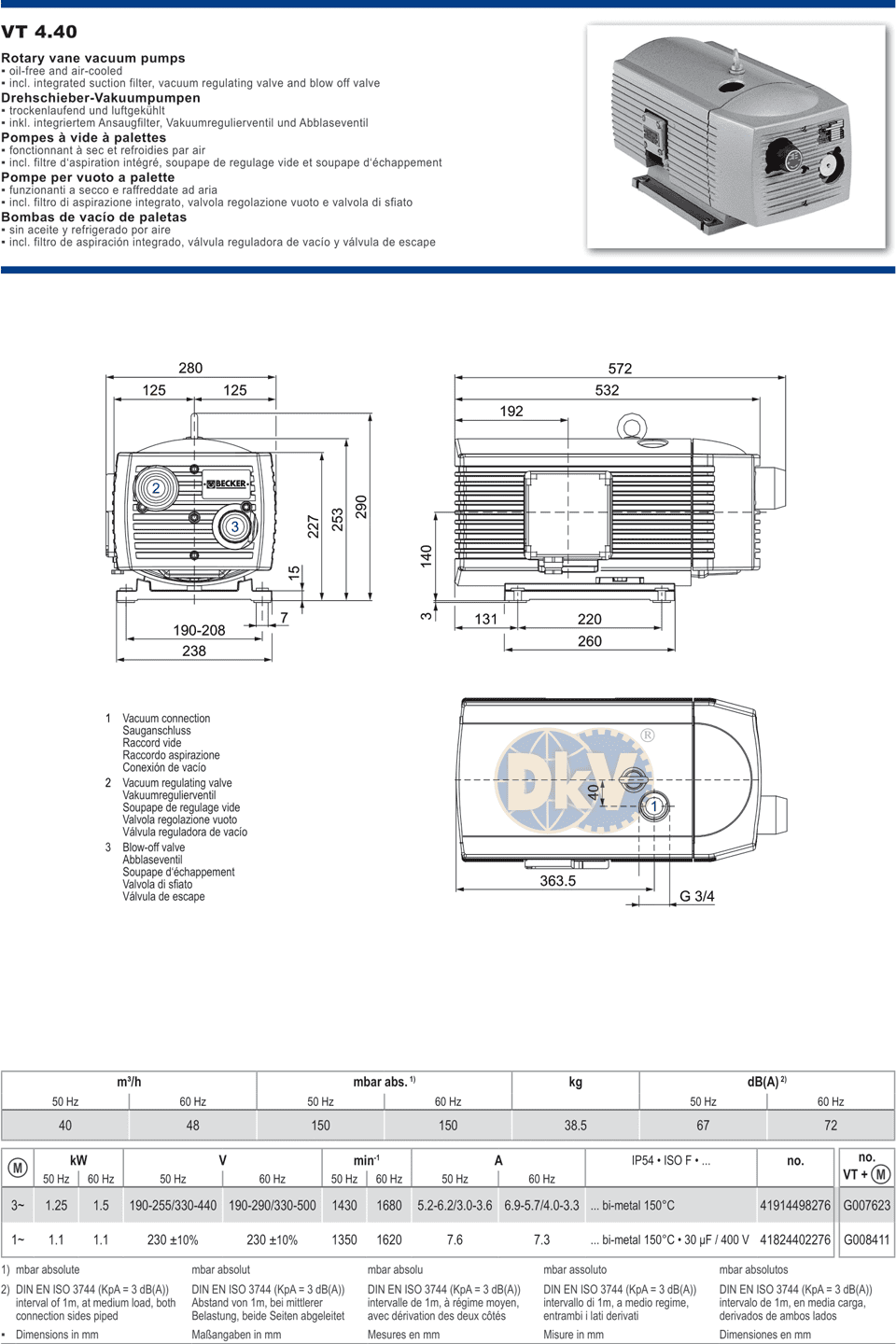 Bơm chân không Beker VT 4.40 gắn động cơ: 1.1 kW/220 - 230V/50Hz/1ph hoặc 1.25 kW/380 - 400 V/50Hz/3ph, cấp bảo vệ IP54, tốc độ động cơ: 1.350 - 1.430 rpm, độ ồn trung bình: 67 dB(A).