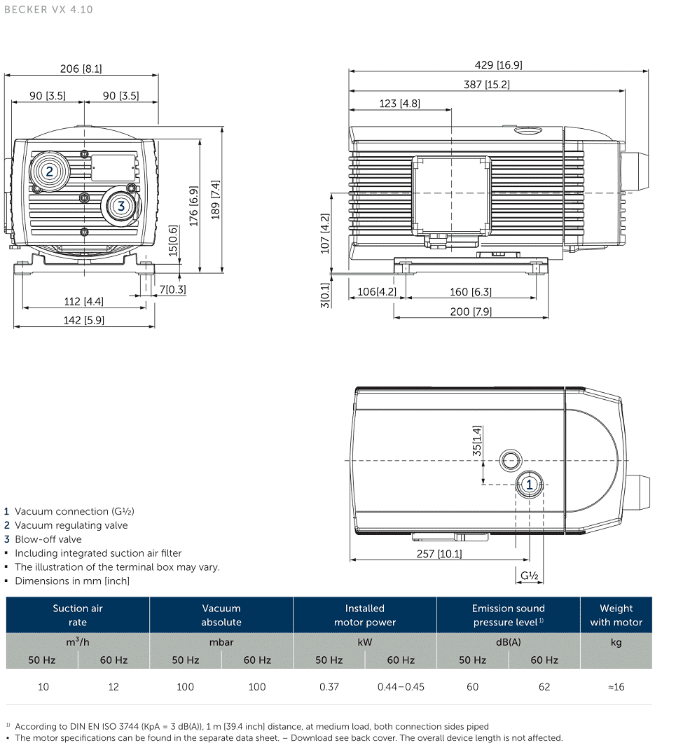 Bơm chân không Beker VX 4.10 có độ ồn trung bình: 60 dB(A) gắn động cơ điện 0.37 kW/230V/50Hz/1ph hoặc 0.37 kW/380 - 400V/50Hz/3ph (cấp bảo vệ IP54.ISO F), tốc độ vòng quay động cơ: 1.630 - 1.700 rpm.