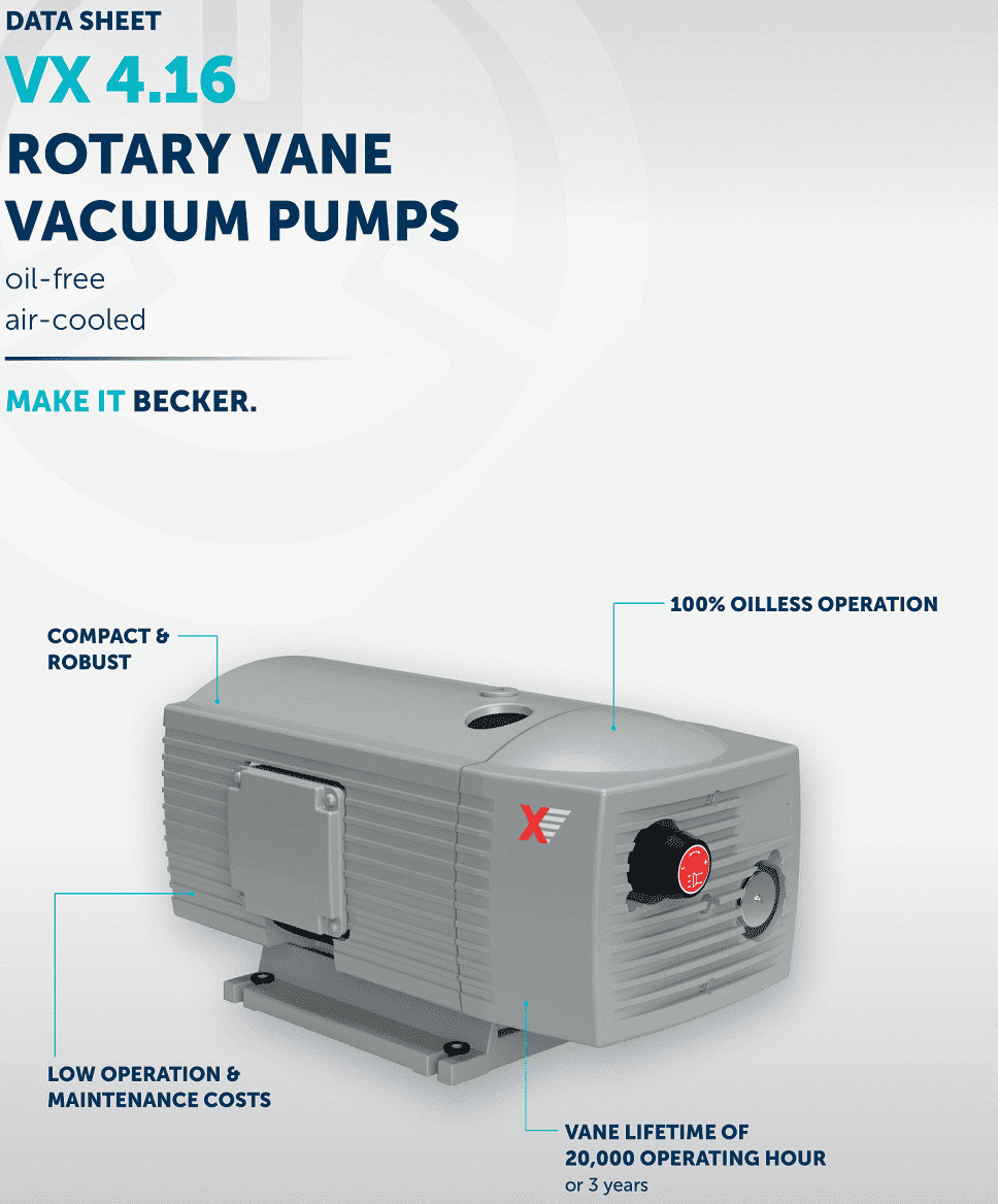 Công nghệ tạo chân không của Bơm chân không Beker VX 4.16: cánh gạt composite (7 cánh). Thao tác lắp đặt vận hành, đơn giản, nhanh gọn. Thân vỏ bằng gang đúc, chắc chắn, thoát nhiệt tốt giúp bơm hoạt động em ái ổn định, tuổi thọ dài lâu. Size cổ hút: 1/2".