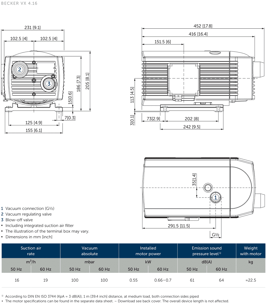 Bơm chân không Becker VX 4.16 có độ ồn trung bình: 61 dB(A), sử dụng động cơ điện: 0.55 kW, 230V/50Hz/1ph hoặc 380 - 400V/50Hz/3ph (cấp bảo vệ IP54.ISO F), tốc độ vòng quay động cơ: 1.600 - 1.700 rpm.