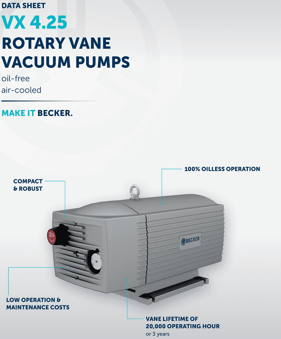 Bơm chân không Becker VX 4.25, Becker vacuum pump VX 4.25 là loại bơm chân không không dầu dùng trong dây chuyền công nghiệp sạch...Bơm chân không Becker VX4.25 có độ chân không tuyệt đối 100 mbar, với lưu lượng max: 25 m3/h.