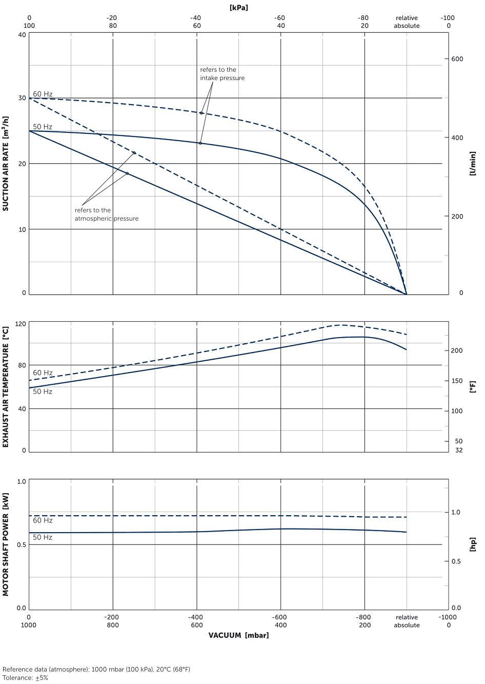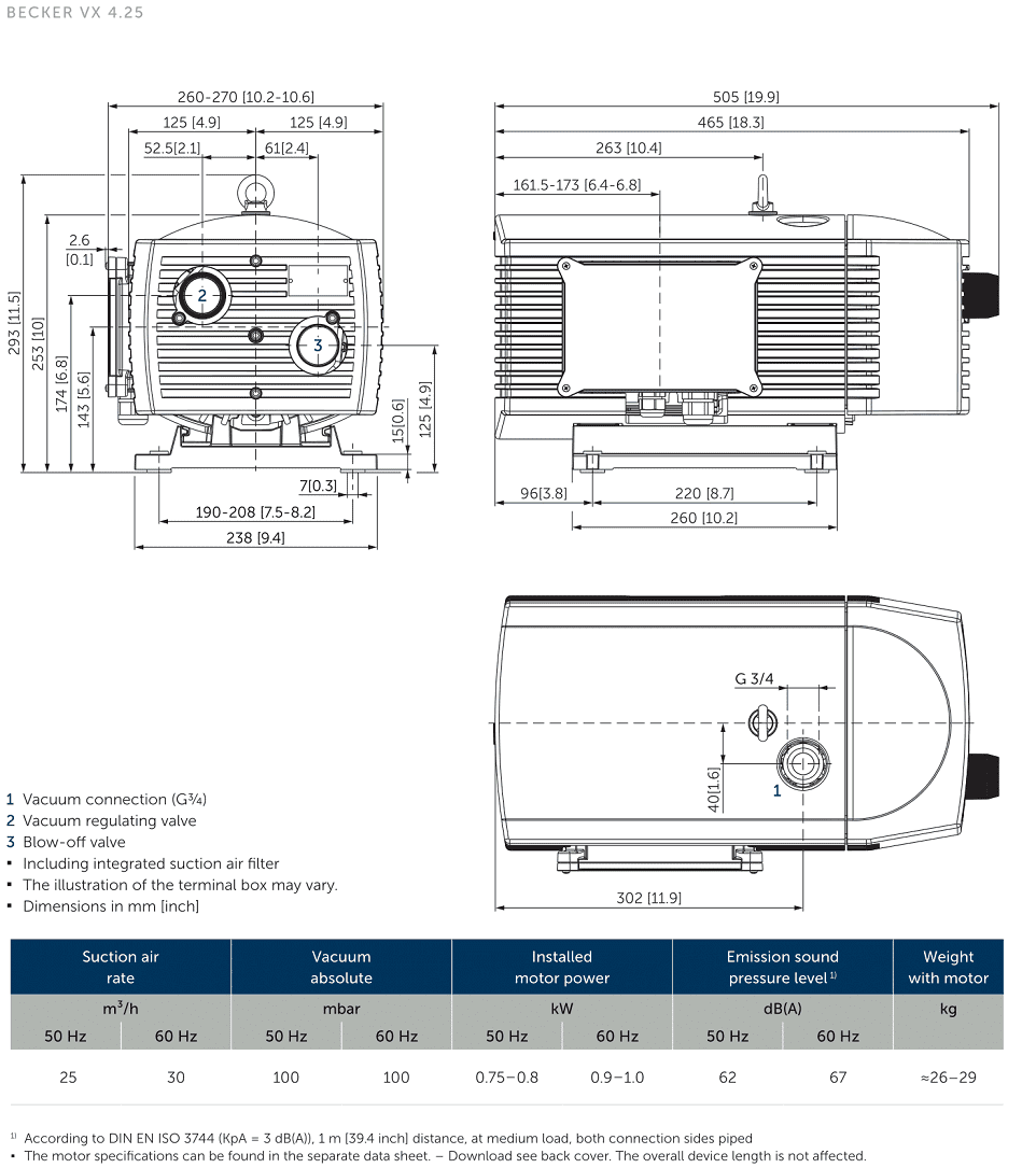 Bơm chân không Becker VX 4.25 có độ ồn trung bình: 61 dB(A), sử dụng động cơ điện: 0.8 kW, 230V/50Hz/1ph hoặc 0.75 kW, 380 - 400V/50Hz/3ph (cấp bảo vệ IP54.ISO F), tốc độ vòng quay động cơ: 1.350 - 1.430 rpm.