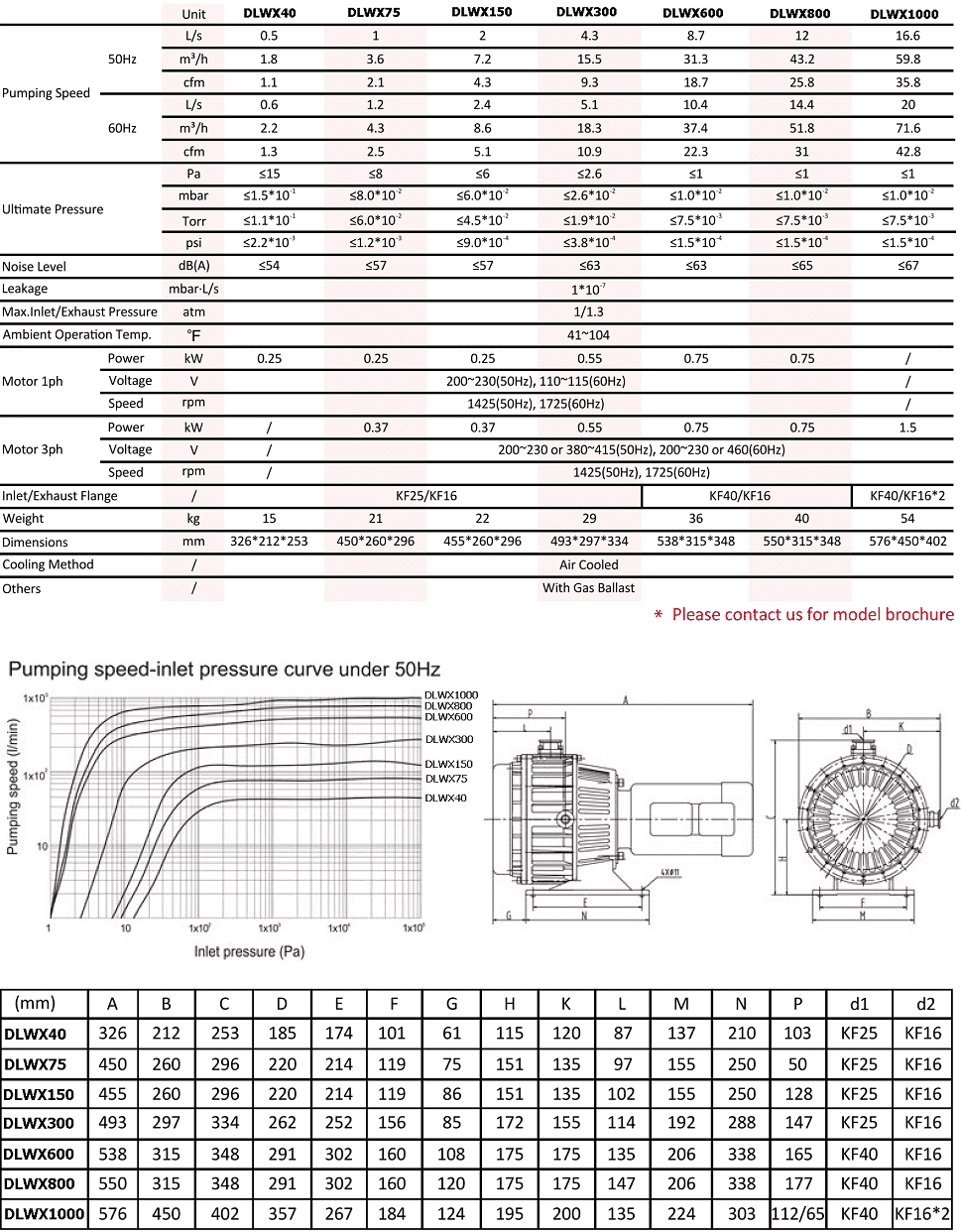 Bơm chân không khô DKV VACUUM DLWX150, bơm hút chân không DKV VACUUM DLWX150, DKV VACUUM dry scroll vacuum pump DLWX150: thuộc dạng bơm hút chân không khô, không dầu (Dry scroll vacuum pump), có lưu lượng max: 7.2 m3/h, độ chân không sâu nhất: 0.06 mbar (6.10-2 mbar), độ dò rỉ tĩnh < 1x10-7mbar, chuyên dùng để hút chân không trong công nghiệp.
