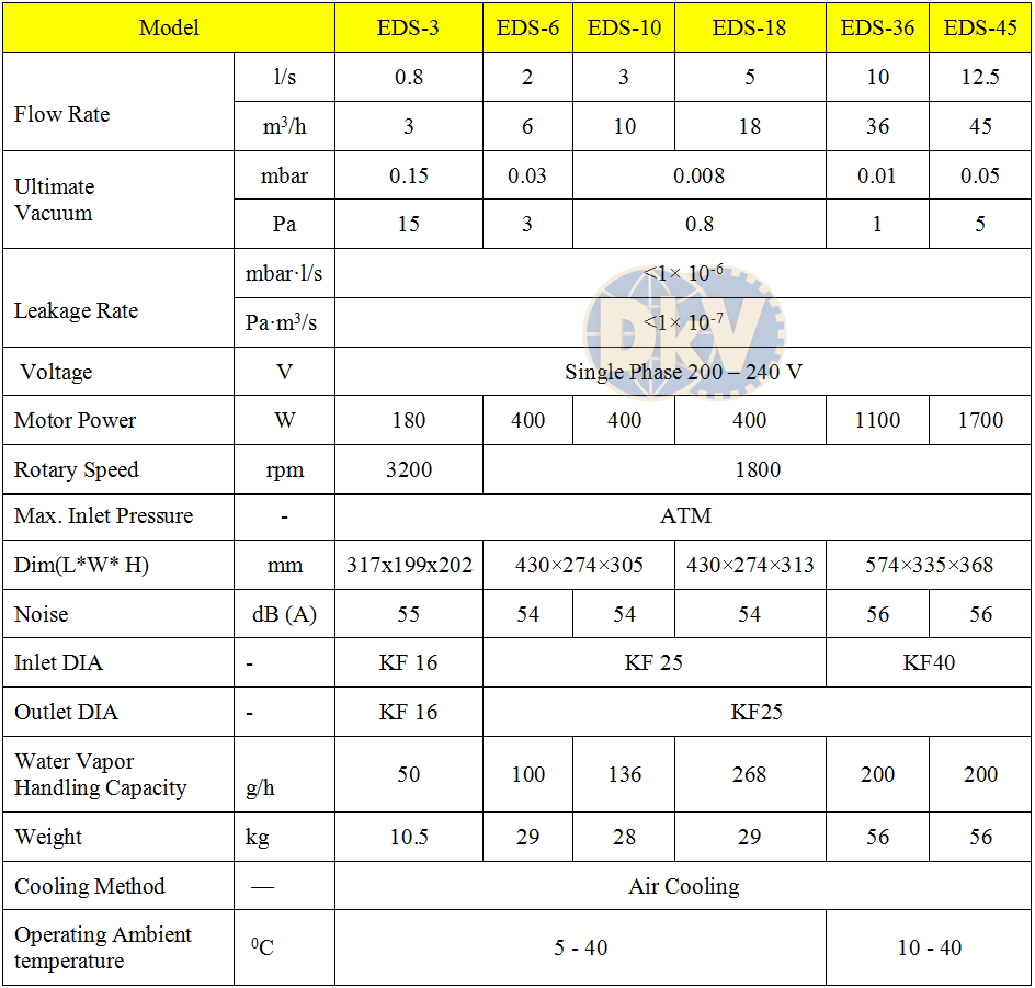 Bơm chân không khô EVP EDS-3, bơm hút chân không EDS-3, EVP scroll dry vacuum pump EDS-3: thuộc dạng bơm hút chân không khô, không dầu (scroll dry vacuum pump), có lưu lượng max: 3 m3/h, độ chân không sâu nhất: 0.15 mbar (15 Pa), độ dò rỉ tĩnh < 1x10-6mbar, chuyên dùng để hút chân không trong công nghiệp.