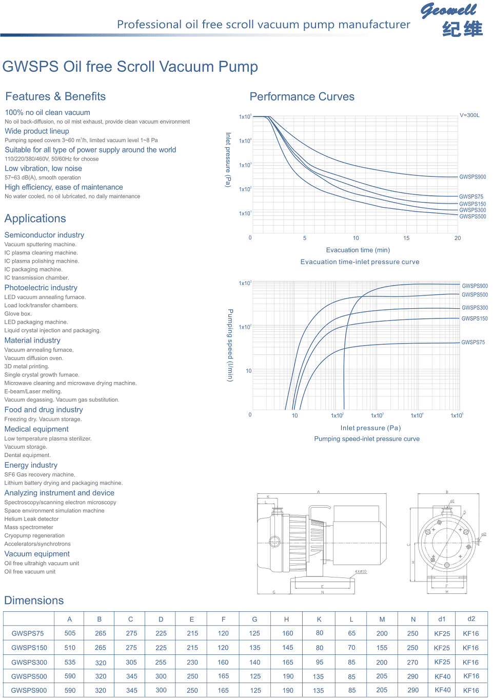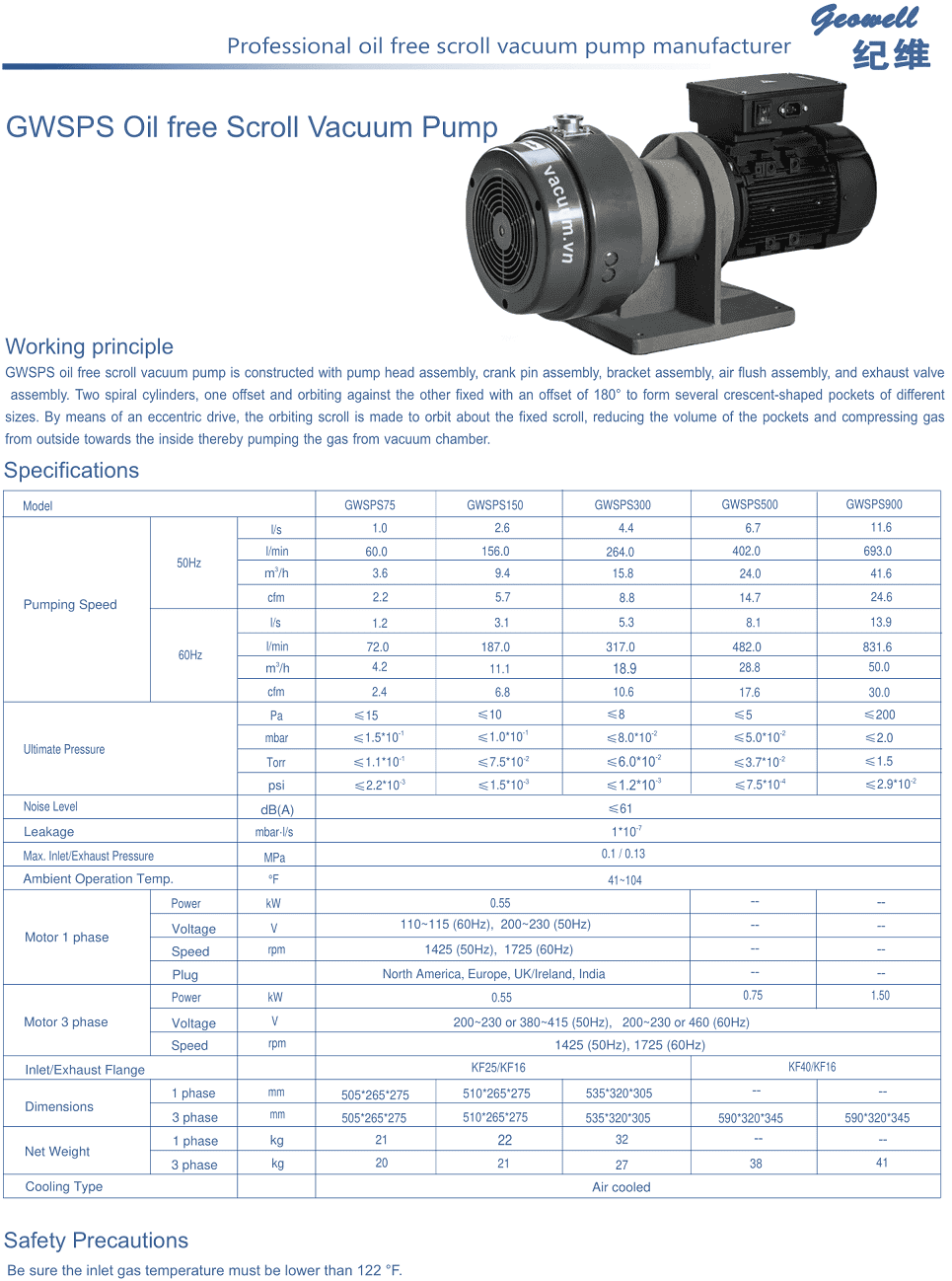 Bơm chân không Geowell GWSPS900, bơm hút chân không Geowell GWSPS900, Geowell dry scroll vacuum pump GWSPS900 thuộc dạng bơm hút chân không khô, không dầu (Dry scroll vacuum pump), có lưu lượng max: 41.6 m3/h, độ chân không sâu nhất: 2 mbar, độ dò rỉ tĩnh < 1x10-7mbar, chuyên dùng để hút chân không trong công nghiệp.