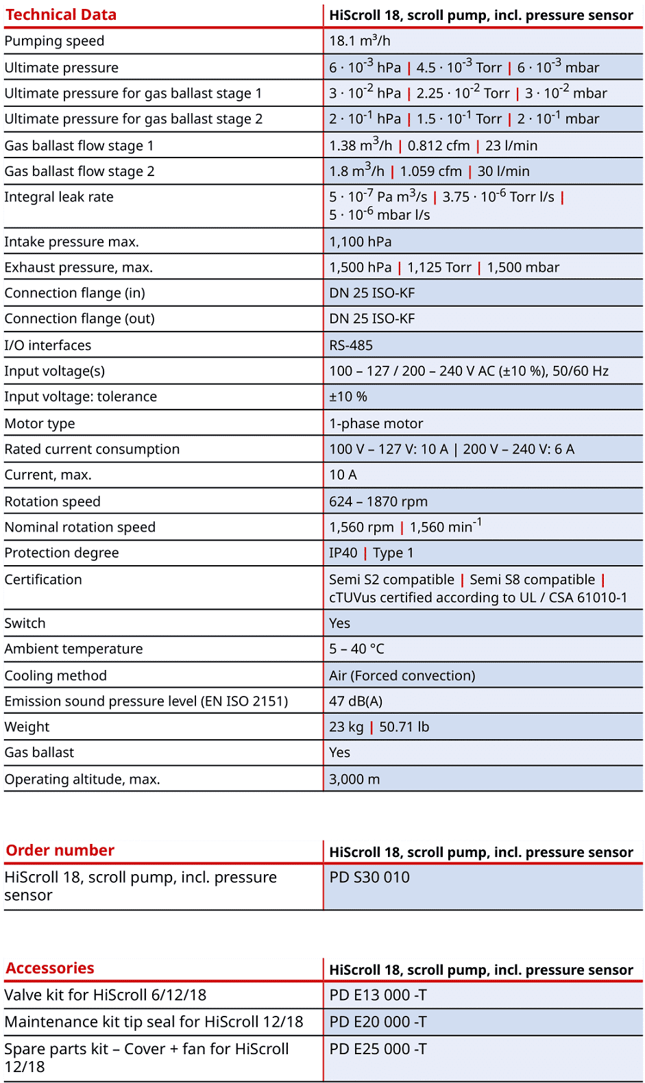 Bơm chân không Pfeiffer HiScroll 18, bơm hút chân không Pfeiffer HiScroll 18, Pfeiffer Dry vacuum pump HiScroll 18: là loại bơm hút chân không không dầu (oil-free) có lưu lượng: 18.1 m3/h, độ chân không đạt < 6.10-3 mbar, độ dò rỉ tĩnh < 5x10-7mbar, chuyên dùng để hút chân không trong công nghiệp.