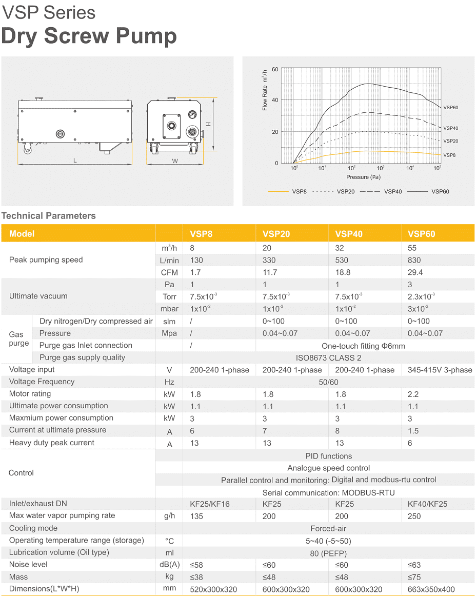 Bơm chân không khô trục vít Value VSP60, Value dry screw vacuum pumps VSP60: thuộc dạng bơm hút chân không khô. không dầu loại nhỏ, kiểu trục vít, có lưu lượng: 55 m3/h, độ chân không đạt: 3 Pa | 0.03 mbar, chuyên dùng để hút chân không trong công nghiệp.