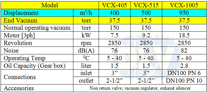Bơm chân không khô Wonvac VCX-1005, Wonvac dry claw vacuum pumps VCX-1005: thuộc dạng bơm hút chân không khô. không dầu cỡ lớn, kiểu móng vuốt (claw), có lưu lượng: 950 m3/h, độ chân không sâu nhất đạt: 37.5 torr, độ chân không trung bình: 75 torr, chuyên dùng để hút chân không trong công nghiệp.