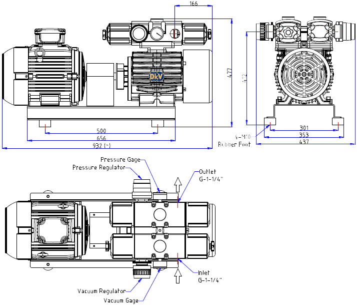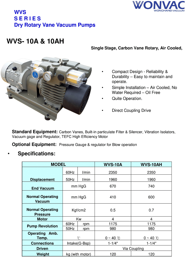 Bơm chân không khô Wonvac WVS-10AH, Wonvac dry rotary vanes vacuum pumps WVS-10AH: thuộc dạng bơm hút chân không khô. không dầu loại trung bình, kiểu cánh gạt (rotary vanes), có lưu lượng: 1960 lít/phút, độ chân không sâu nhất đạt: - 740 mmHg (đối với chức năng hút chân không), và nén 0.7 kgf.cm2 | 0.7 bar (đối với chức năng nén khí), chuyên dùng để hút chân không trong công nghiệp.