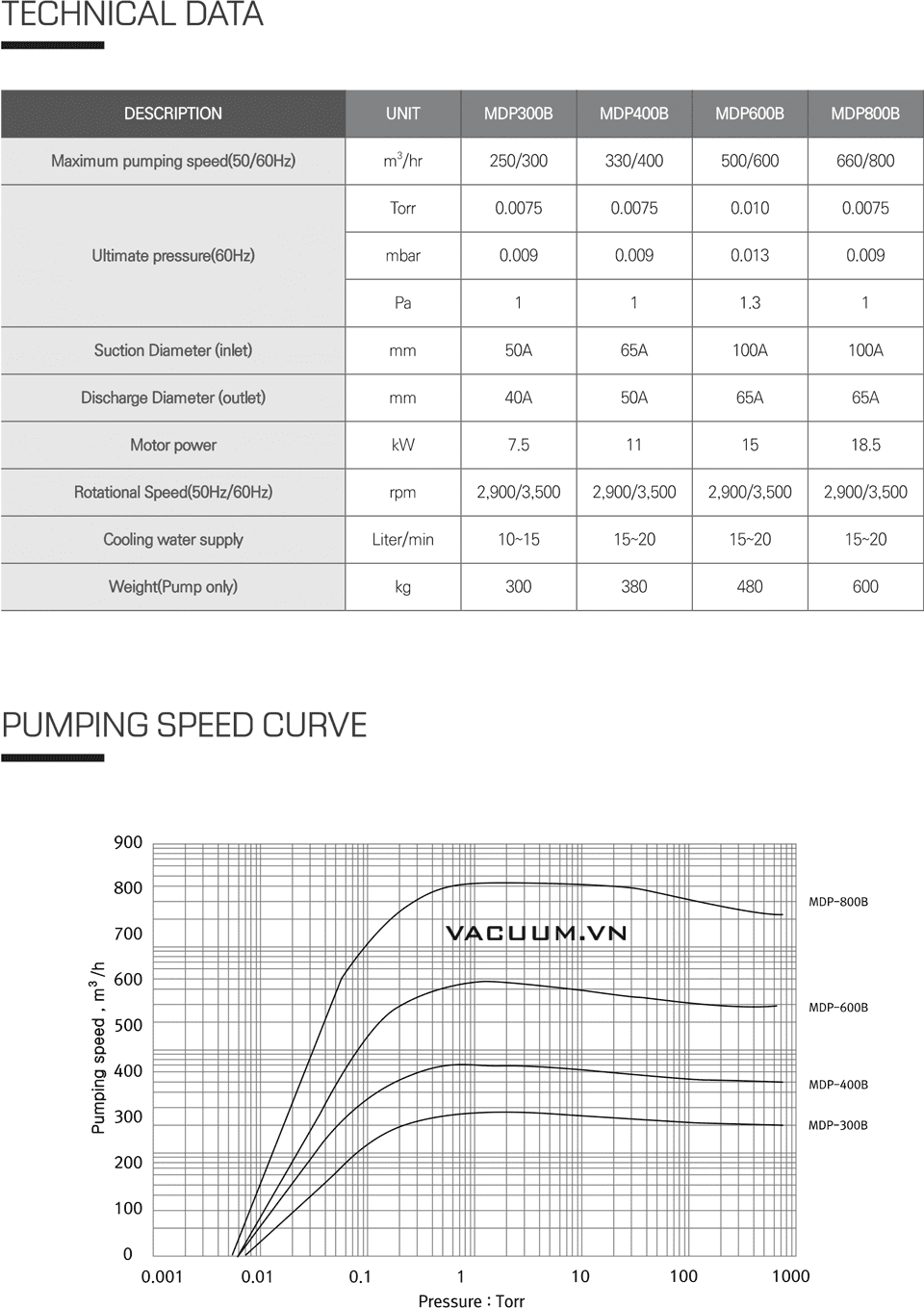 Bơm chân không khô trục vít Woosung MDP300B, Woosung dry screw vacuum pumps MDP300B: thuộc dạng bơm hút chân không khô. không dầu, kiểu trục vít, có lưu lượng: 250 m3/h, độ chân không đạt: 0.0075 Torr | 9.10-3 mbar, chuyên dùng để hút chân không trong công nghiệp.