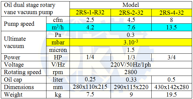 Bơm chân không mini 2RS-1-R32, Oil Lubricated Rotary Vane Vacuum Pumps 2RS-1-R32: thuộc dạng bơm hút chân không vòng dầu (oil-flooded), 2 cấp (dual stage), loại nhỏ mini, có lưu lượng: 4.2 m3/h (2.5 cfm), độ chân không đạt: 3x10-3 mbar (3 Pa), trang bị valve điện từ cùng áp kế, tụ điện chống cháy nổ, chuyên dùng để hút chân không cho các khí gas R32 trong dân dụng, phòng thí nghiệm và công nghiệp.