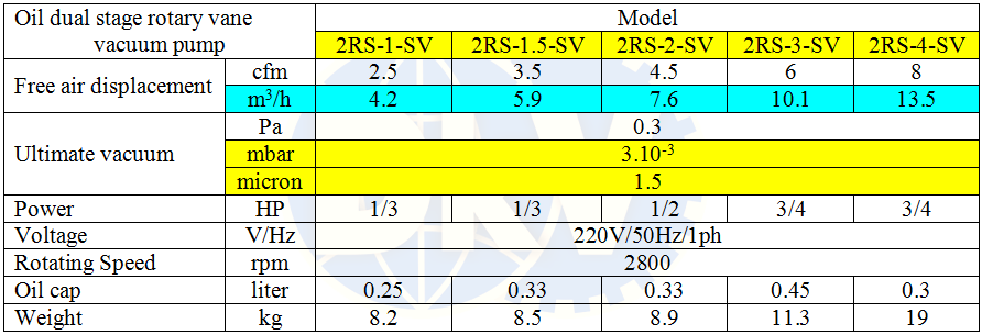 Bơm chân không mini 2RS-4-SV, Oil Lubricated Rotary Vane Vacuum Pumps 2RS-4-SV: thuộc dạng bơm hút chân không vòng dầu (oil-flooded), 2 cấp (dual stage), loại nhỏ mini, trang bị valve điện từ cùng áp kế, có lưu lượng: 13.5 m3/h (8 cfm), độ chân không đạt: 3x10-3 mbar (0.3 Pa) chuyên dùng để hút chân không trong dân dụng, phòng thí nghiệm và công nghiệp.