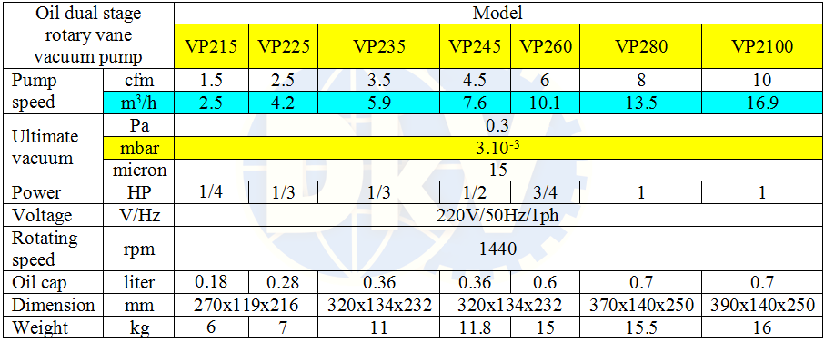 Bơm chân không mini VP225, Oil Lubricated Rotary Vane Vacuum Pumps VP225: thuộc dạng bơm hút chân không vòng dầu (oil-flooded), 2 cấp (dual stage), loại nhỏ mini, có lưu lượng: 4.2 m3/h (2.5 cfm), độ chân không đạt: 3x10-3 mbar (0.3 Pa) chuyên dùng để hút chân không trong dân dụng, phòng thí nghiệm và công nghiệp.