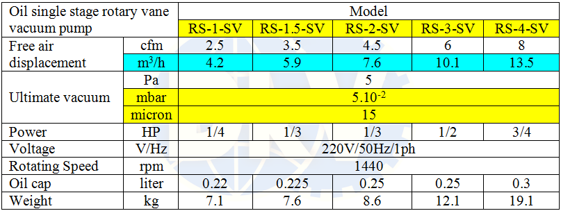 Bơm chân không mini RS-3-SV, Oil Lubricated Rotary Vane Vacuum Pumps RS-3-SV: thuộc dạng bơm hút chân không vòng dầu (oil-flooded), 1 cấp (single stage), loại nhỏ mini, có lưu lượng: 10.1 m3/h (6 cfm), độ chân không đạt: 5x10-2 mbar (5 Pa), trang bị valve điện từ cùng áp kế, chuyên dùng để hút chân không trong dân dụng, phòng thí nghiệm và công nghiệp.