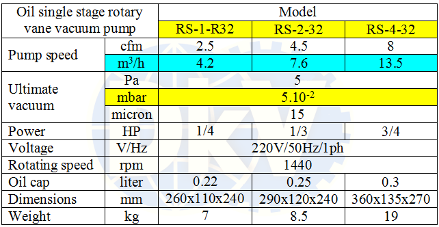 Bơm chân không mini RS-4-R32, Oil Lubricated Rotary Vane Vacuum Pumps RS-4-R32: thuộc dạng bơm hút chân không vòng dầu (oil-flooded), 1 cấp (single stage), loại nhỏ mini, có lưu lượng: 13.5 m3/h (8 cfm), độ chân không đạt: 5x10-2 mbar (5 Pa), trang bị valve điện từ cùng áp kế, tụ điện chống cháy nổ, chuyên dùng để hút chân không cho các khí gas R32 trong dân dụng, phòng thí nghiệm và công nghiệp.
