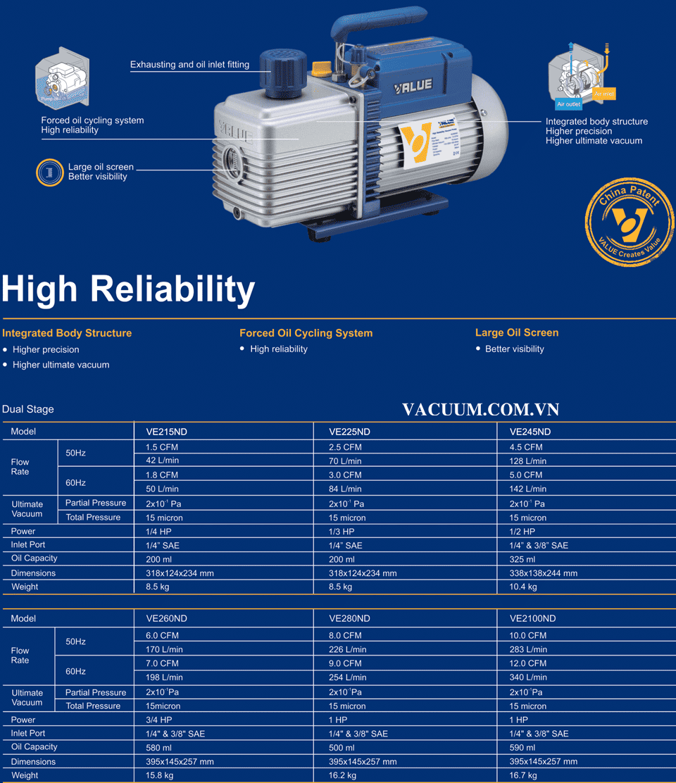 Bơm chân không Value VE215ND, Value oil Lubricated Rotary Vane Vacuum Pumps VE215ND thuộc dạng bơm hút chân không vòng dầu (oil-flooded), 2 cấp (dual stage), loại nhỏ mini, có lưu lượng: 2.5 m3/h (1.5 cfm), độ chân không đạt: 2x10-3 mbar (0.2 Pa) chuyên dùng để hút chân không trong dân dụng, phòng thí nghiệm và công nghiệp.