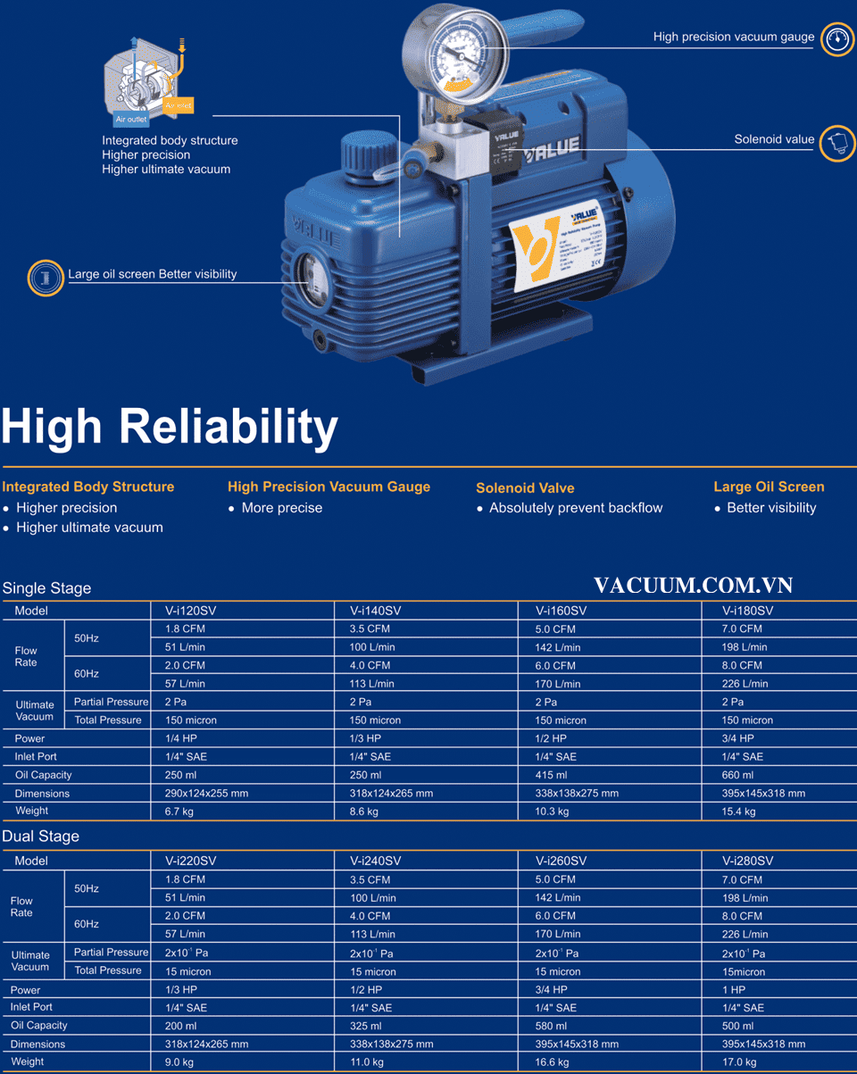 Bơm chân không Value V-i240SV, Value oil Lubricated Rotary Vane Vacuum Pumps V-i240SV thuộc dạng bơm hút chân không vòng dầu (oil-flooded), 2 cấp (single stage), loại nhỏ mini, có lưu lượng: 5.9 m3/h (3.5 cfm), độ chân không đạt: 2x10-3 mbar (0.2 Pa) chuyên dùng để hút chân không trong dân dụng, phòng thí nghiệm và công nghiệp.