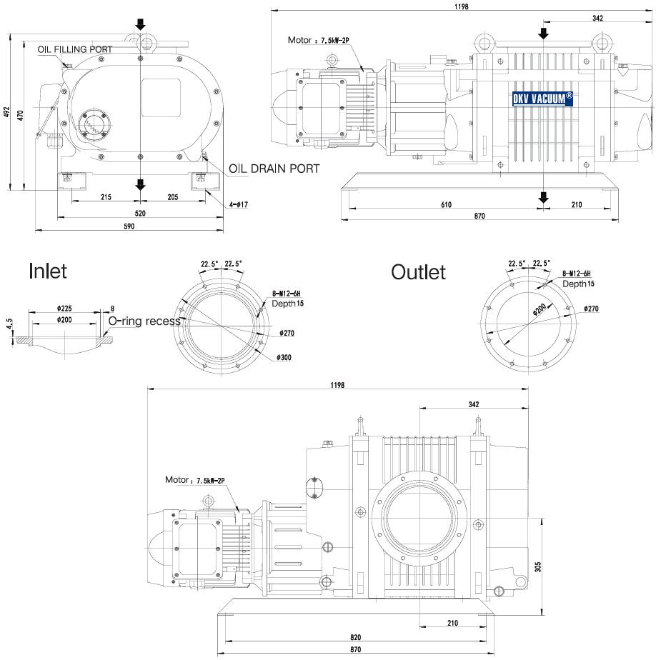 Bơm tăng áp chân không Baosi BSJ600L có độ ồn trung bình: 68 dB(A), sử dụng 3 phase 7.5 kW/380 - 400 V/50Hz/3ph (cấp bảo vệ IP54.ISO F). Size cổ hút/cổ xả: VG200 | VF200. Dung tích dầu bôi trơn: 4 lít.