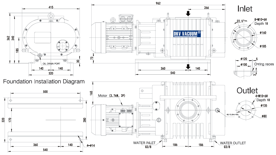 Bơm tăng áp chân không Baosi BSJ300L có độ ồn trung bình: 68 dB(A), sử dụng 3 phase 3.7 kW/380 - 400 V/50Hz/3ph (cấp bảo vệ IP54.ISO F). Size cổ hút/cổ xả: VG100 | VF80. Dung tích dầu bôi trơn: 2 lít.