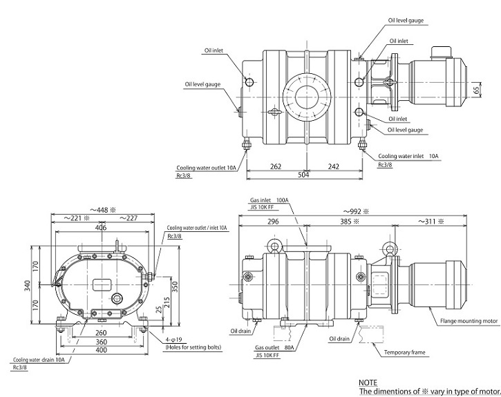 Bơm tăng áp chân không Osaka RD600 có độ ồn trung bình: 75 dB(A). Size cổ hút/xả: tiêu chuẩn JIS 10 K 100A | JIS 10K 80A. Dung tích dầu bôi trơn: 2.7 lít.