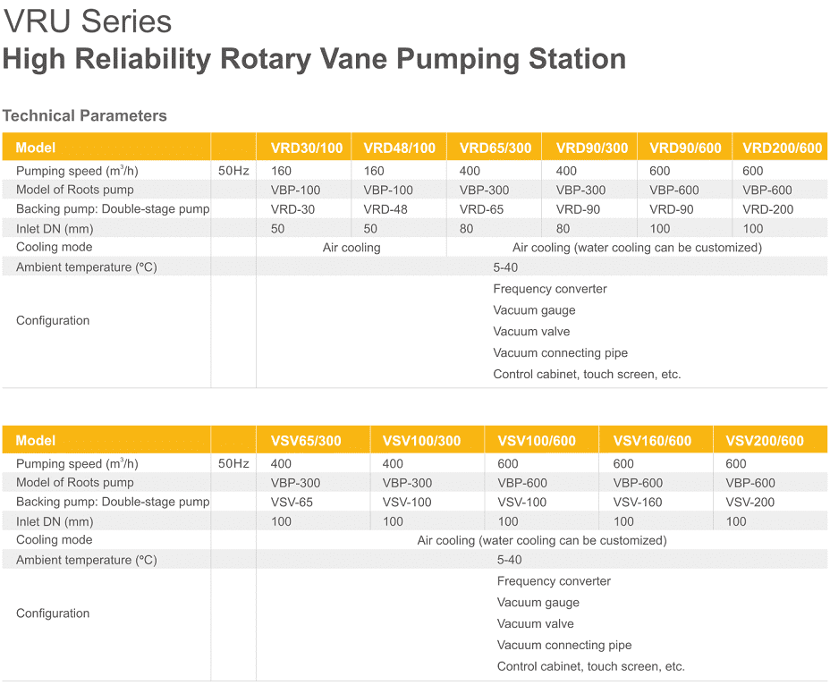 Bản chất bơm chân không tăng áp Value VRD48/100 là sự ghép đôi của bơm tăng áp trục vít Value VBP-100 (160 m3/h, 4.10-4 mbar, 0.37 kW/380V/50Hz/3ph) làm bơm sơ cấp và bơm chân không vòng dầu 2 cấp Value VRD-48 (48 m3/h, 4 x10-4 mbar, 1.5 kW/380V/50Hz/3ph) làm bơm thứ cấp. Quý khách có thể lựa chọn động cơ điện áp: 220V/50Hz/1ph hoặc động cơ phòng chống cháy nổ Ex (Option).