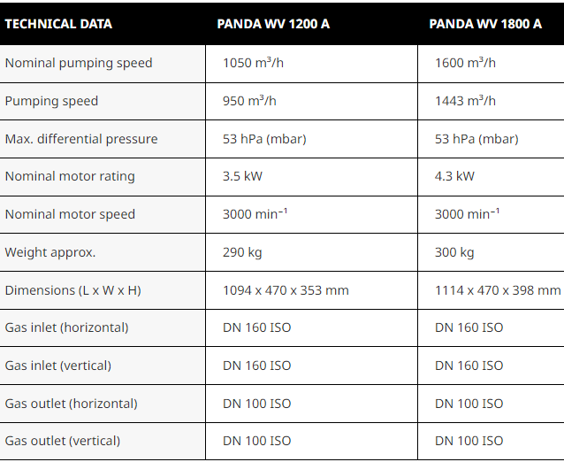 Bơm tăng áp chân không Busch Panda WV 1800 A, Busch roots booster pump Panda WV 1800 A: là loại bơm tăng áp cỡ lớn, lưu lượng max: 1.600 m3/h, phổ dụng trong công nghiệp. Bơm tăng áp chân không Busch Panda WV 1800 A có mức chênh độ chân không trong quá trình làm việc liên tục: 53 mbar.