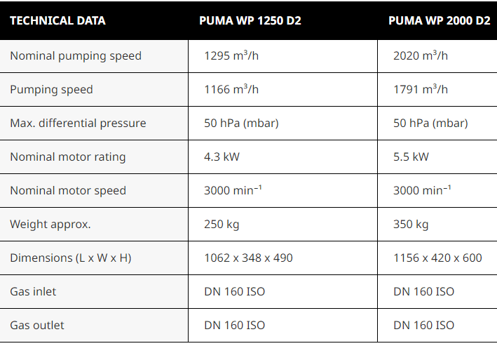 Bơm tăng áp chân không Busch Puma WP 2000 D2, Busch roots booster pump Puma WP 2000 D2: là loại bơm tăng áp cỡ lớn, lưu lượng max: 2.020 m3/h, phổ dụng trong công nghiệp. Bơm tăng áp chân không Busch Puma WP 2000 D2 có mức chênh độ chân không trong quá trình làm việc liên tục: 50 mbar.