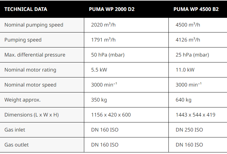 Bơm tăng áp chân không Busch Puma WP 4500 B2, Busch roots booster pump Puma WP 4500 B2: là loại bơm tăng áp cỡ lớn, lưu lượng max: 4.500 m3/h, phổ dụng trong công nghiệp. Bơm tăng áp chân không Busch Puma WP 4500 B2 có mức chênh độ chân không trong quá trình làm việc liên tục: 25 mbar.