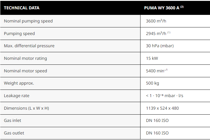 Bơm tăng áp chân không Busch Puma WY 3600 A sử dụng động cơ 3 phase 15 kW/200 - 400 V/50Hz/3ph, 5.400 vòng/phút (cấp bảo vệ IP54.ISO F), độ ồn trung bình: 67 dB(A). Size cổ hút/xả: DN 160 | DN 160. Dung tích dầu bôi trơn: 3.5 lít (1.3 lít tại vị trí motor, 2.2 lít tại vị trí đầu bơm). Busch chỉ định sử dụng dầu: YLC 250 B.