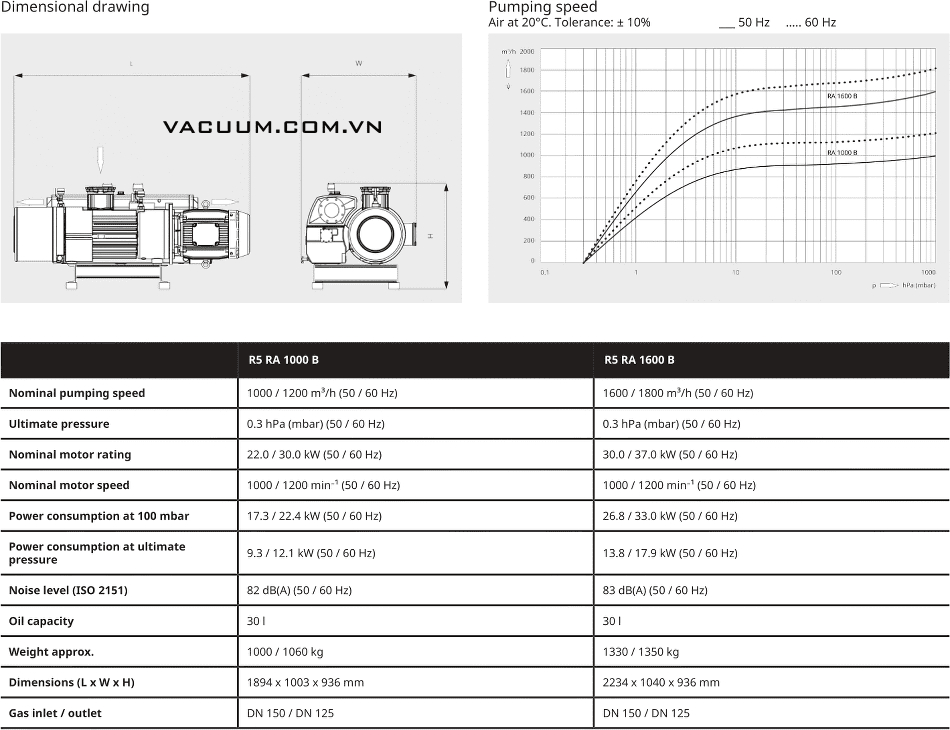 Bơm chân không Busch R5 RA 1600 B sử dụng động cơ: 30 kW /380V/50Hz/3ph, tốc độ vòng quay max: 1.000 rpm, độ ồn tối đa: 83 dBA.