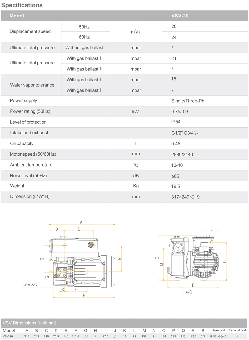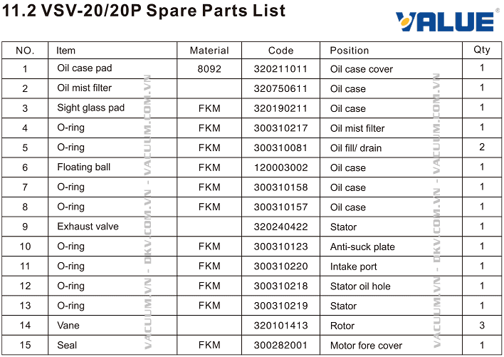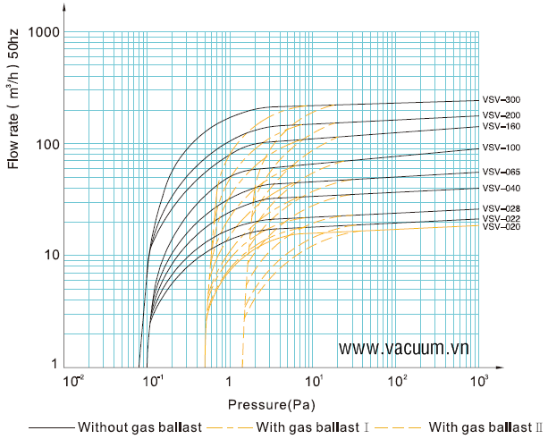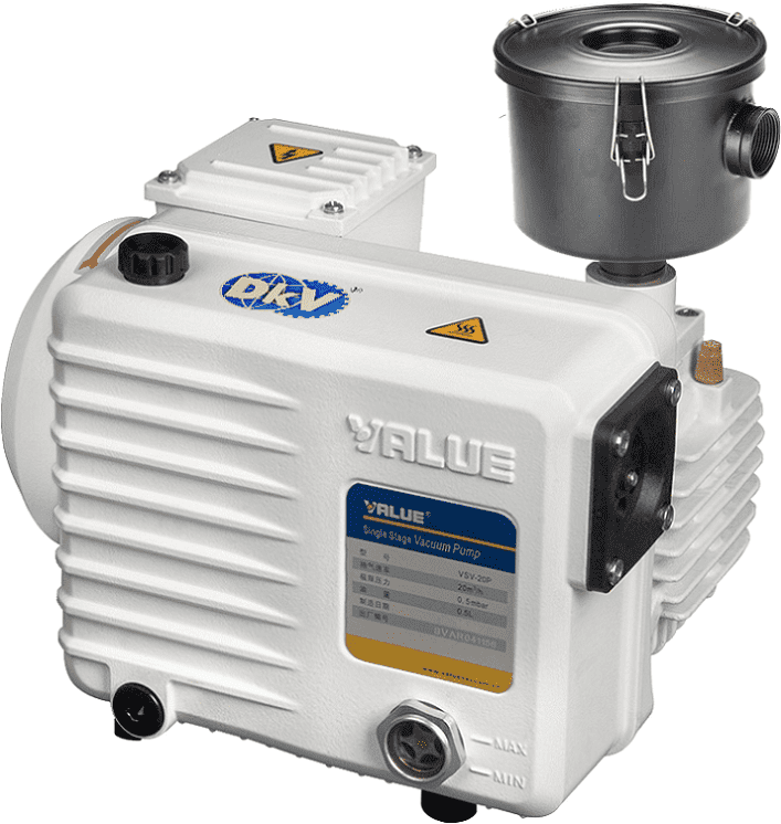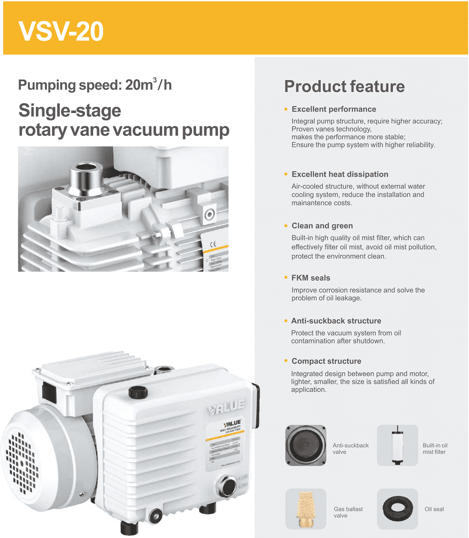 Bơm chân không Value VSV-20, Value Oil Lubricated Rotary Vane Vacuum Pumps VSV-20 thuộc dạng bơm hút chân không vòng dầu (oil-flooded), 1 cấp (single stage) có lưu lượng: 20 m3/h, độ chân không 1 mbar (chân lưu khí gas ballast ở nấc 1), áp chịu hơi nước: 15 mbar, chuyên dùng để hút chân không trong công nghiệp.