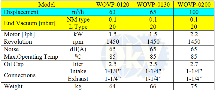 Bơm chân không Wonvac WOVP-0200, Wonvac Oil Lubricated Rotary Vane Vacuum Pumps WOVP-0200: thuộc dạng bơm hút chân không vòng dầu (oil-flooded), 1 cấp (single stage) có lưu lượng: 100 m3/h, độ chân không 0.1 mbar (khi chân lưu khí gas ballast đóng), 20 mbar (khi mở chấn lưu khí gas ballast), chuyên dùng để hút chân không trong công nghiệp.