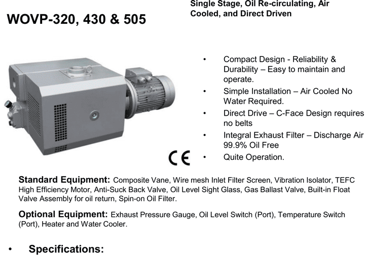 Ngoài cung cấp bơm chân không Wonvac WOVP-0505H và các sản phẩm (dầu chân không, lọc chân không, cánh gạt và phụ tùng Wonvac) luôn có sẵn, chúng tôi còn có sẵn các loại bơm chân không tiêu chuẩn, chất lượng tương đương của DooVac | Korea hoặc giá rẻ của Value | China để thỏa mãn sự lựa chọn thêm của khách hàng, phù hợp với tiêu chí của khách hàng đặt ra.