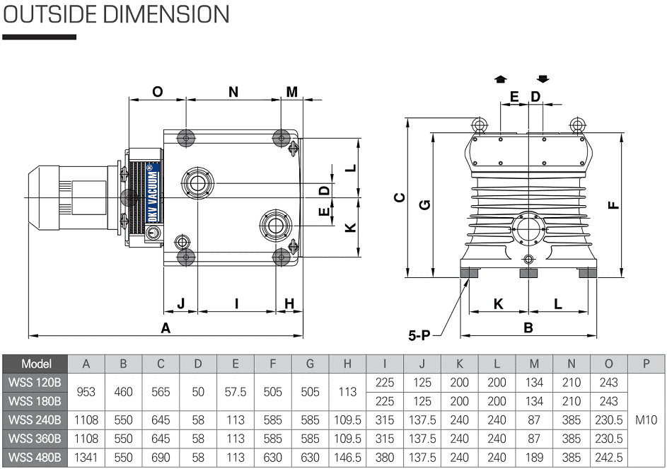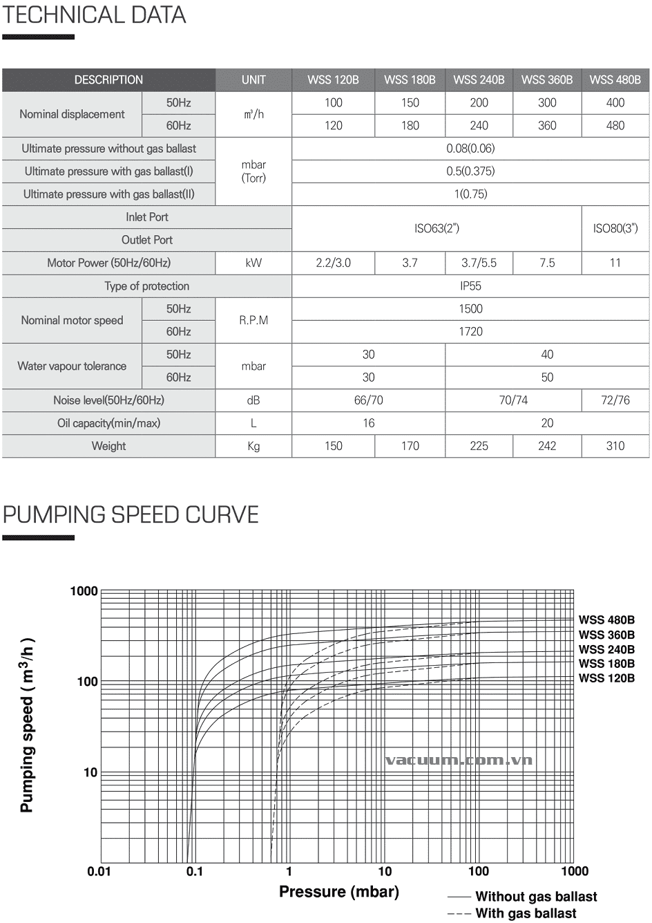Bơm chân không Woosung WSS 360B, Woosung Oil Lubricated Rotary Vane Vacuum Pumps WSS 360B thuộc dạng bơm hút chân không vòng dầu (oil-flooded), 1 cấp (single stage) có lưu lượng: 300 m3/h, độ chân không 0.5 mbar | 0.375 Torr (khi mở chấn lưu khí Gas Ballast ở nấc 1), 1 mbar | 0.75 Torr (khi mở chấn lưu khí Gas Ballast ở nấc 2) và 0.08 mbar | 0.06 Torr (khi đóng chấn lưu khí Gas Ballast, ở nấc C), áp chịu hơi nước: 40 torr. chuyên dùng để hút chân không trong công nghiệp.