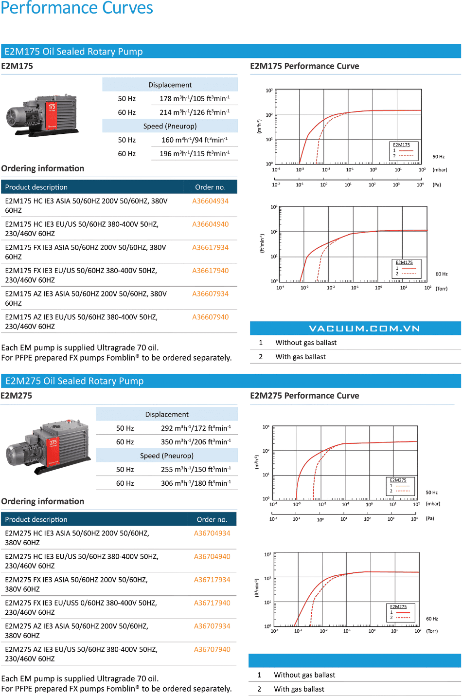 Bơm chân không Edwards E2M275, bơm hút chân không Edwards E2M275, Edward Vacuum oil sealed rotary vane pump E2M275 là loại bơm chân không vòng dầu 2 cấp, cỡ lớn, có lưu lượng: 292 m3/h, độ chân không 5x10-3 mbar | 3.8x10-3Torr (khi mở chấn lưu khí Gas Ballast) và 1x10-3 mbar | 7.7x10-4Torr (khi đóng chấn lưu khí Gas Ballast), áp chịu hơi nước: 12 mbar | 9 torr, chuyên dùng để hút chân không trong công nghiệp.