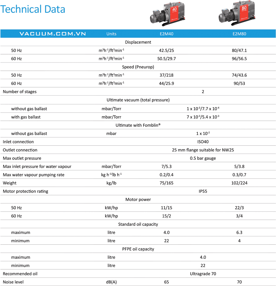 Bơm chân không Edwards E2M80 có độ ồn max: 70 dB(A), sử dụng động cơ: 2.2 kW, điện áp 380-400V/50-60Hz/3ph, cấp bảo vệ IP55, tiêu chuẩn IEC EN60320 C13.
