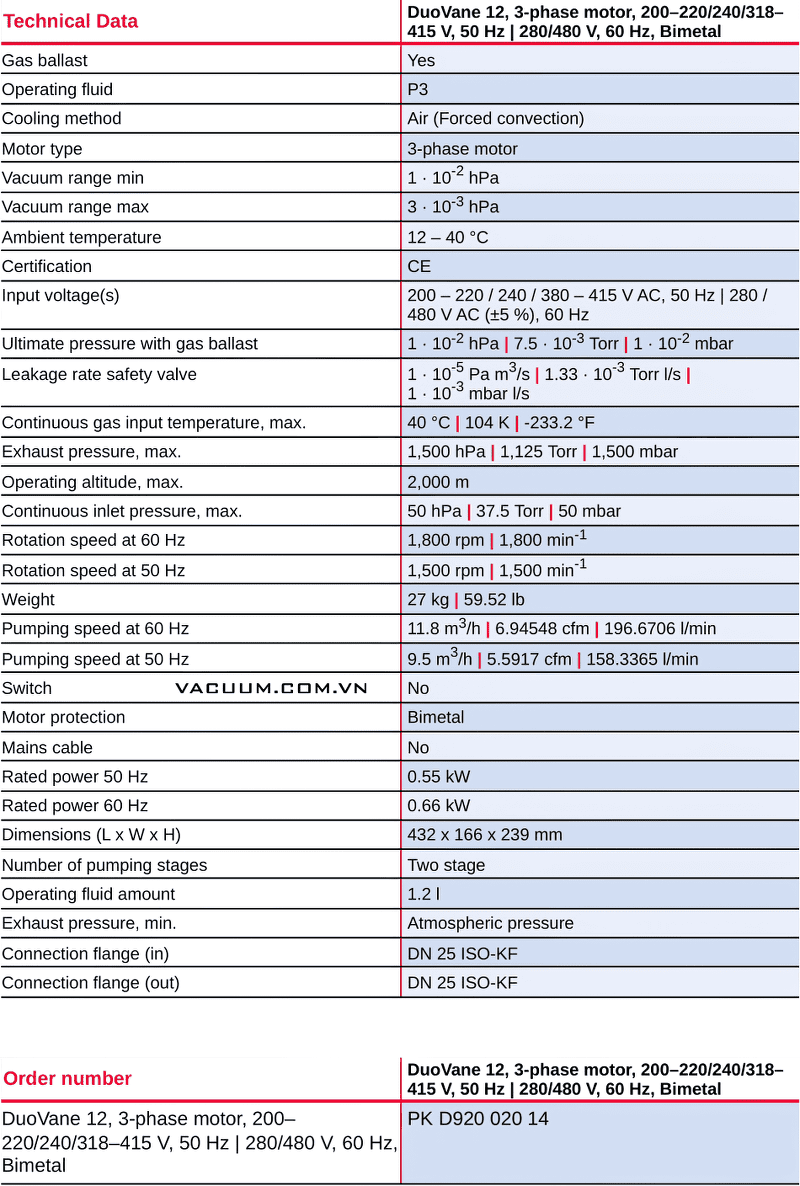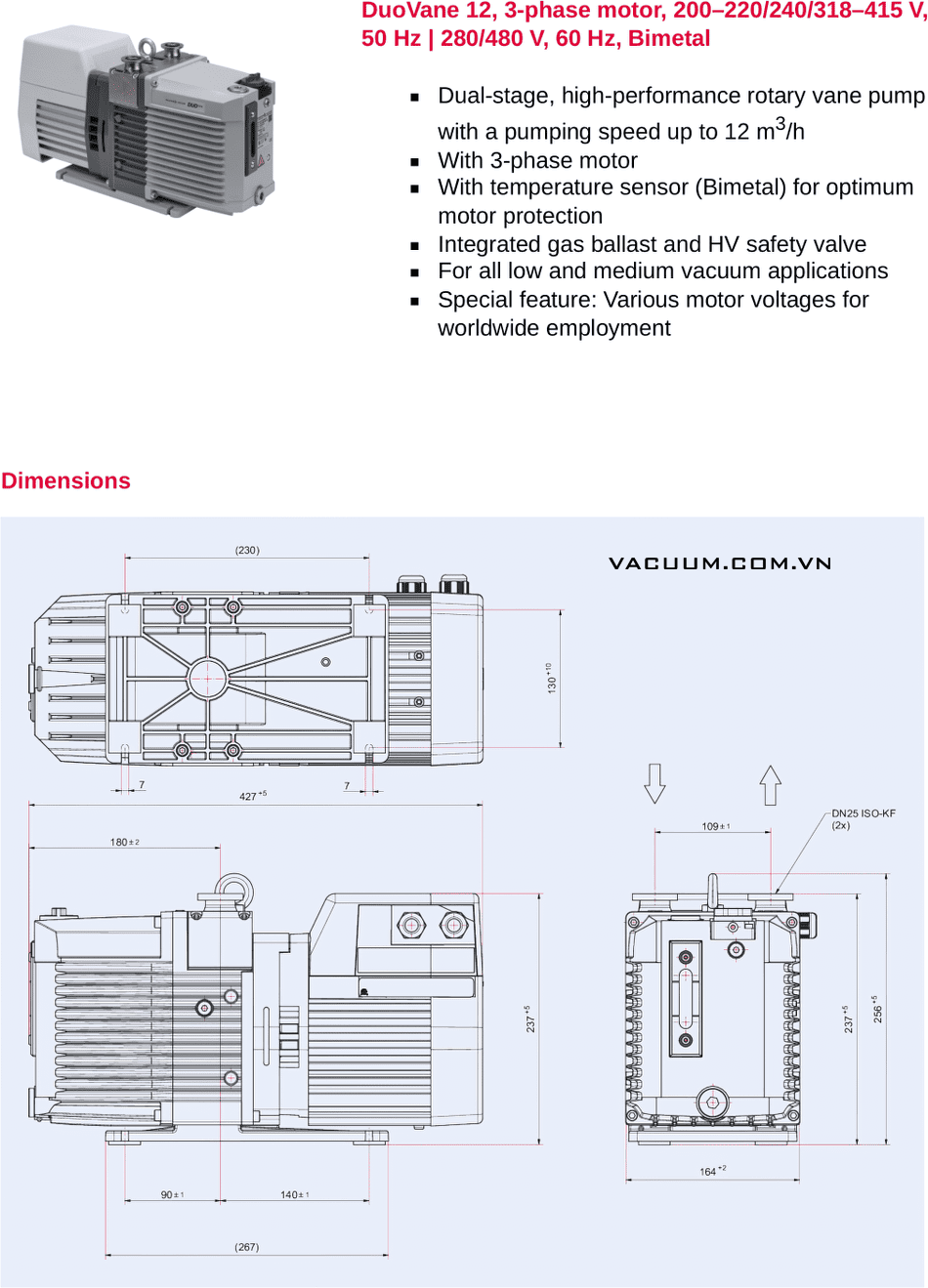 Bơm chân không Pfeiffer DuoVane 12 sử dụng động cơ 0.55 kW/220-240V/50hz/1ph, cấp bảo vệ: IP43.