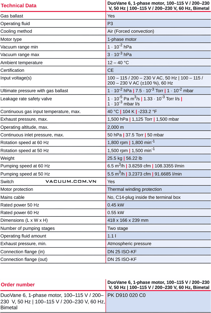 Bơm chân không Pfeiffer DuoVane 6 sử dụng động cơ 0.55 kW/220-240V/50hz/1ph, cấp bảo vệ: IP43.