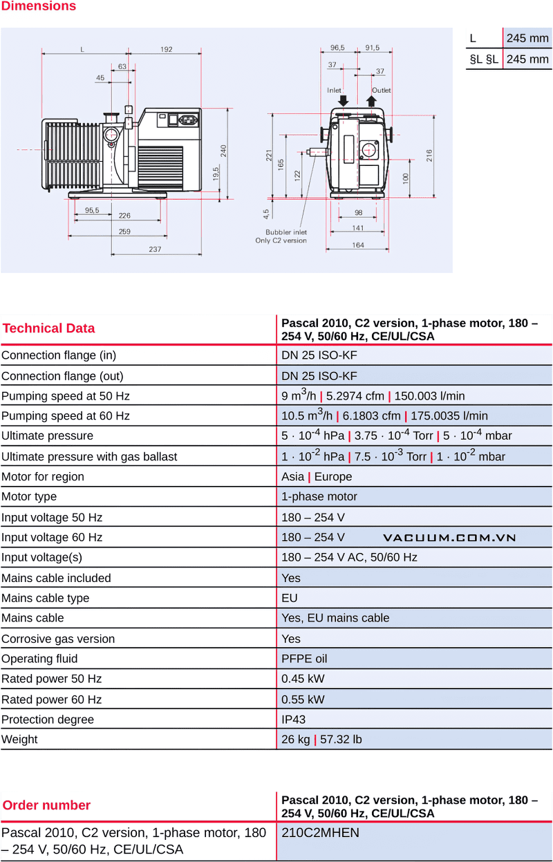Bơm chân không Pfeiffer Pascal 2010 C2 sử dụng động cơ 0.45 kW/220-240V/50hz/1ph, cấp bảo vệ: IP43.