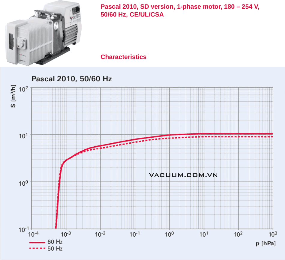 Bơm chân không Pfeiffer Pascal 2010 SD, Pfeiffer vacuum pump Pascal 2010 SD: là loại bơm chân vòng dầu (cánh gạt), thuộc dòng Pascal do hãng Pfeiffer/Đức sản xuất, lưu lượng max: 9 m3/h, độ chân không tối đa: 5 x 10-4mbar (khi mở valve chấn lưu: 1 x 10-2mbar). Bơm chân không Pfeiffer Pascal 2010 SD sử dụng phổ biến trong công nghiệp.