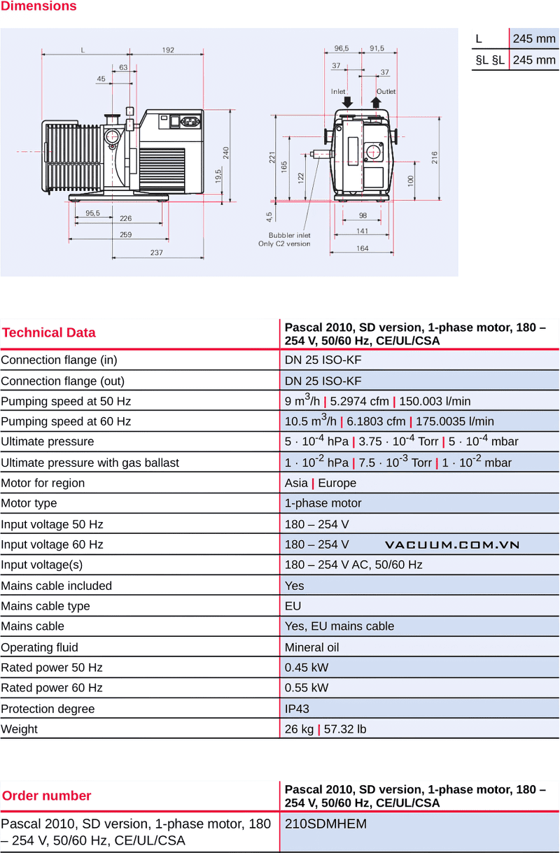 Bơm chân không Pfeiffer Pascal 2010 SD sử dụng động cơ 0.45 kW/180-254V/50hz/1ph, cấp bảo vệ: IP43.