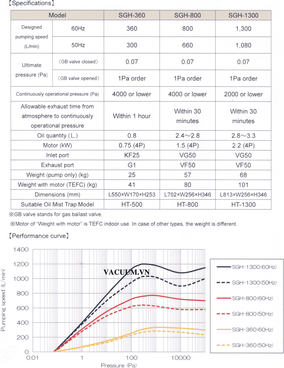 Bơm chân không Shinko Seiki SGH-1300, bơm hút chân không Shinko Seiki SGH-1300, Shinko Seiki oil sealed rotary vacuum pump SGH-1300: là loại bơm chân không vòng dầu (oil-flooded), 2 cấp (dual stage, có lưu lượng max: 1080 lít/phút (64.8 m3/h), độ chân không sâu nhất: 0.07 Pa | 7.10-4 mbar (khi đóng chấn lưu khí Gas Ballast) và 1 Pa | 1.10-2 mbar (khi mở chấn lưu khí Gas Ballast, option) chuyên dùng để hút chân không trong công nghiệp..