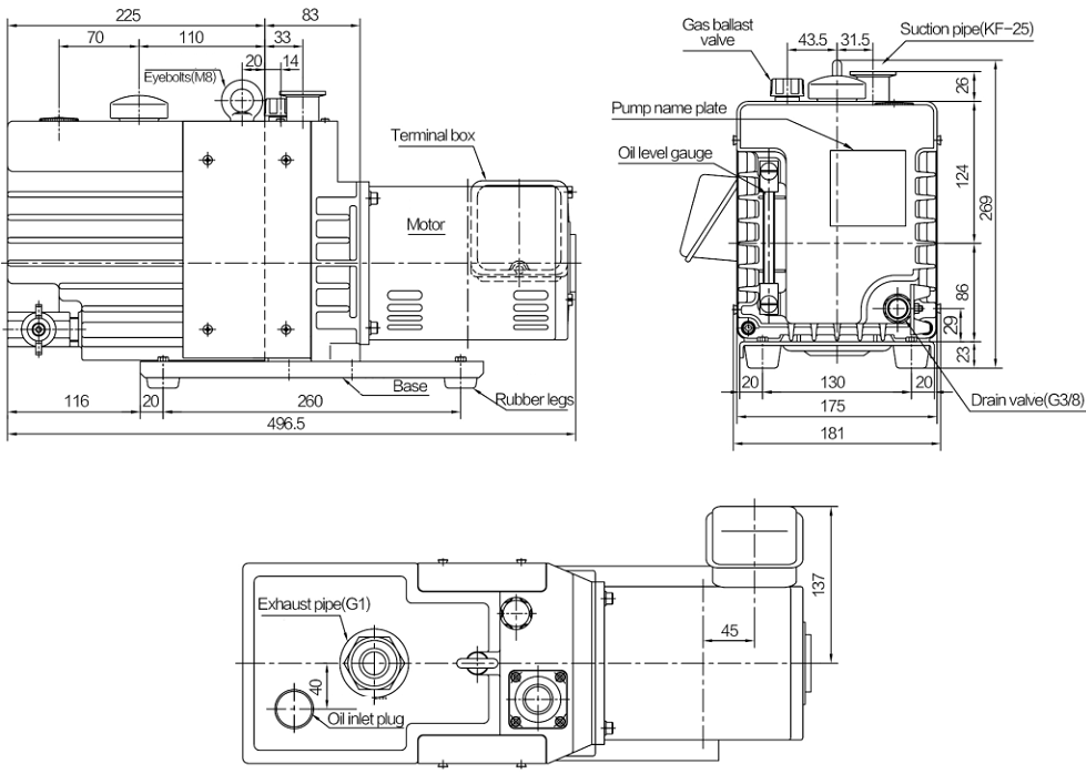 Kích thước (dài x rộng x cao): 496.5 x 181 x 269 mm. Trọng lượng bơm chân không Ulvac GLD-N280 (chưa đổ dầu): 34.5 kg.