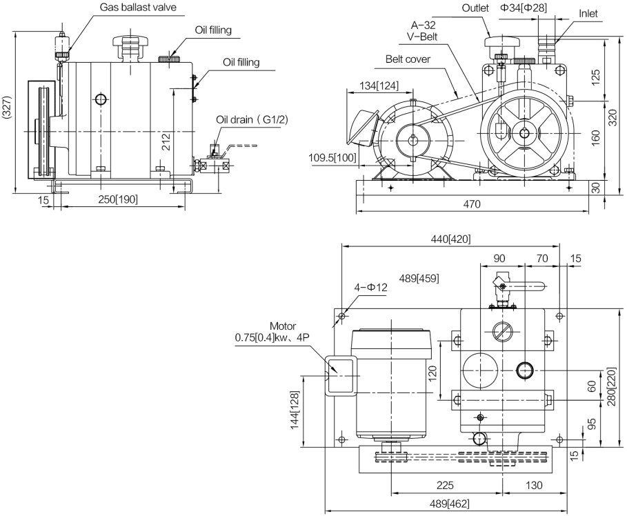 Bơm chân không dẫn động bằng dây đai Ulvac PVD-N180-1 sử dụng động cơ: 0.4 kW, điện áp 380V/50Hz/3ph tiêu chuẩn DIN EN 60034, tốc độ vòng quay động cơ: 900 vòng/phút.