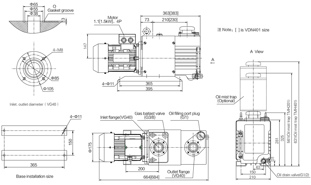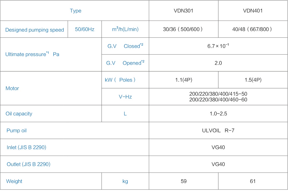 Bơm chân không Ulvac VDN301, sử dụng động cơ: 1.1 kW, điện áp 220V/50-60Hz/1ph, hoặc 380V/50Hz/3ph, tiêu chuẩn IEC EN60320 C13.
