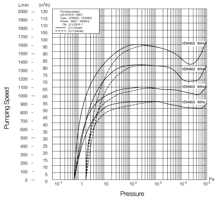 Bơm chân không Ulvac VDN902, bơm hút chân không Ulvac VDN902, Ulvac vacuum oil sealed rotary vane pump VDN902: là loại bơm chân không vòng dầu 2 cấp, cỡ lớn, có lưu lượng: 90 m3/h (1500 lít/phút), độ chân không 2x10-2 mbar | 2 Pa (khi mở chấn lưu khí Gas Ballast) và 6,7x10-3 mbar | 0.67 Pa (khi đóng chấn lưu khí Gas Ballast), chuyên dùng để hút chân không trong công nghiệp.