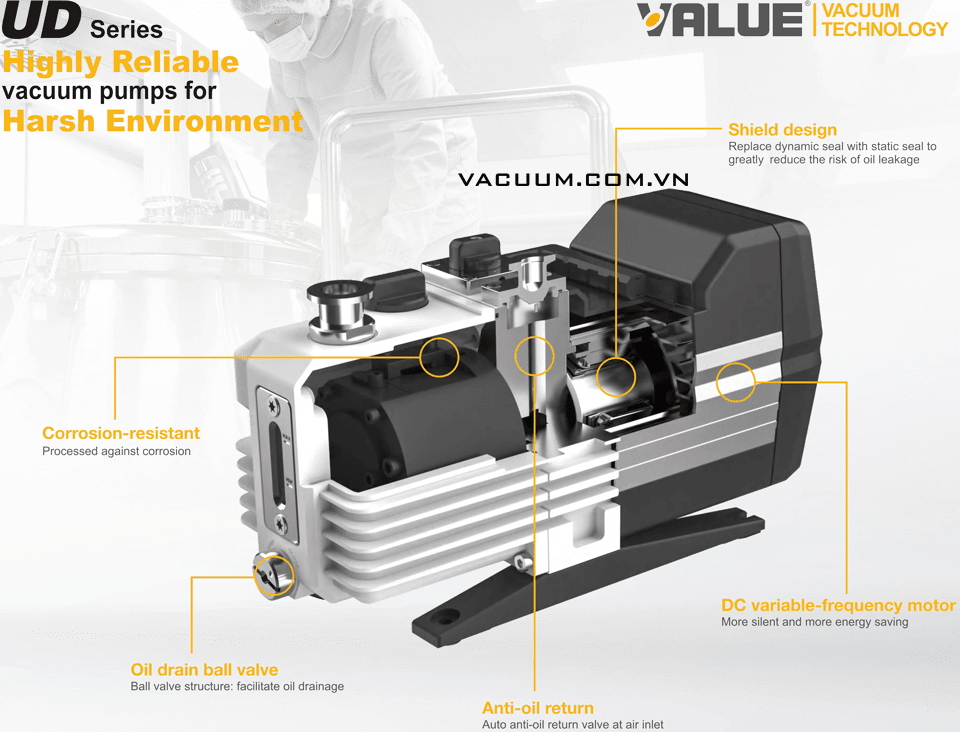 Bơm chân không Value UD2, Value oil lubricated rotary vane vacuum Pumps UD2: thuộc dạng bơm hút chân không vòng dầu (oil-flooded), 2 cấp (dual stage) có lưu lượng: 2.5 m3/h, độ chân không 5.10-1Pa | 5.10-3 mbar (khi đóng chấn lưu khí Gas Ballast) và 3 Pa | 3.10-2 mbar (khi mở chấn lưu khí Gas Ballast), chuyên dùng để hút chân không các loại khí có tính ăn mòn cao, môi trường khắc nghiệt (harsh environment) trong công nghiệp.