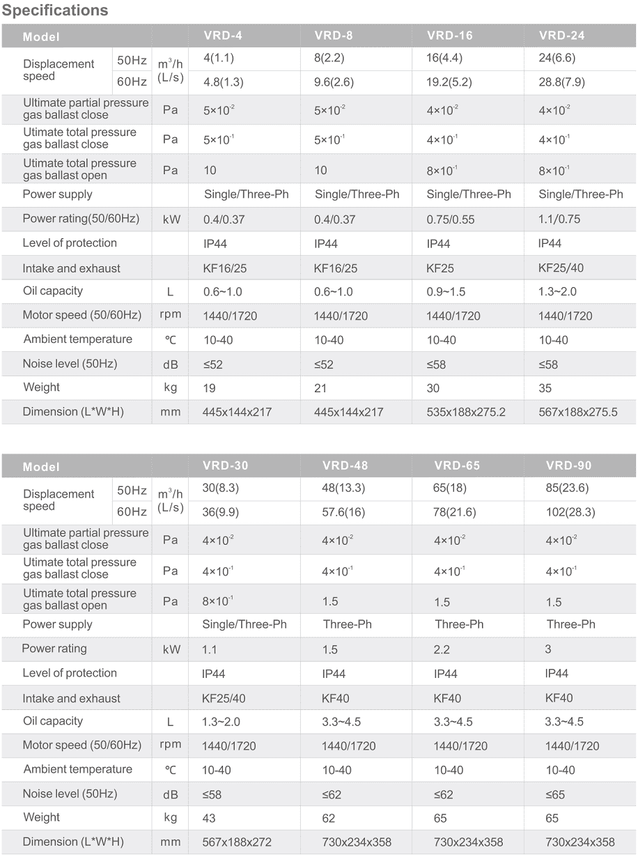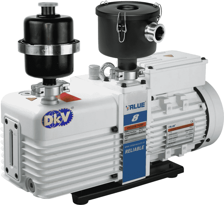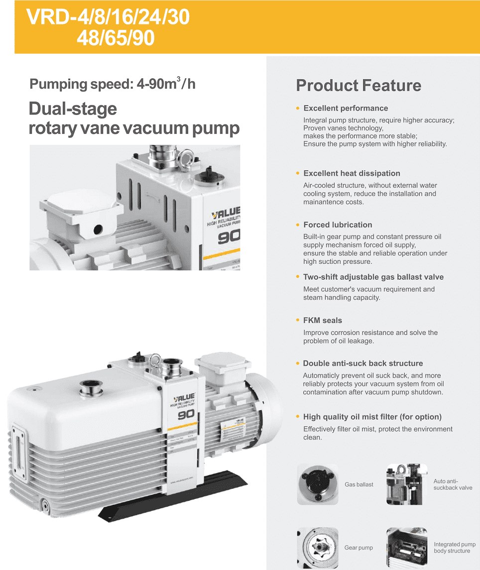 Bơm chân không Value VRD-8, Value Oil Lubricated Rotary Vane Vacuum Pumps VRD-8 thuộc dạng bơm hút chân không vòng dầu (oil-flooded), 2 cấp (dual stage) có lưu lượng: 8 m3/h, độ chân không 5x10-1Pa (khi đóng chấn lưu khí Gas Ballast) và 3 Pa (khi mở chấn lưu khí Gas Ballast), độ chân không tuyệt đối 5x10-2Pa | 5x10-4 mbar (khi đóng chấn lưu khí Gas Ballast) chuyên dùng để hút chân không trong công nghiệp.